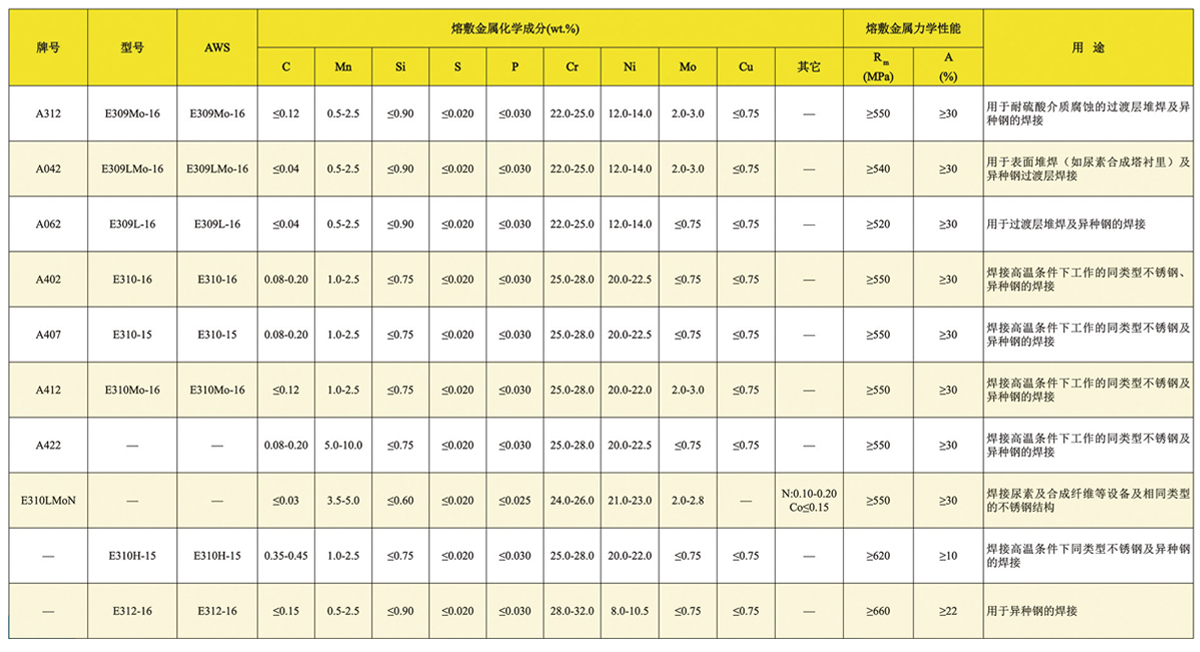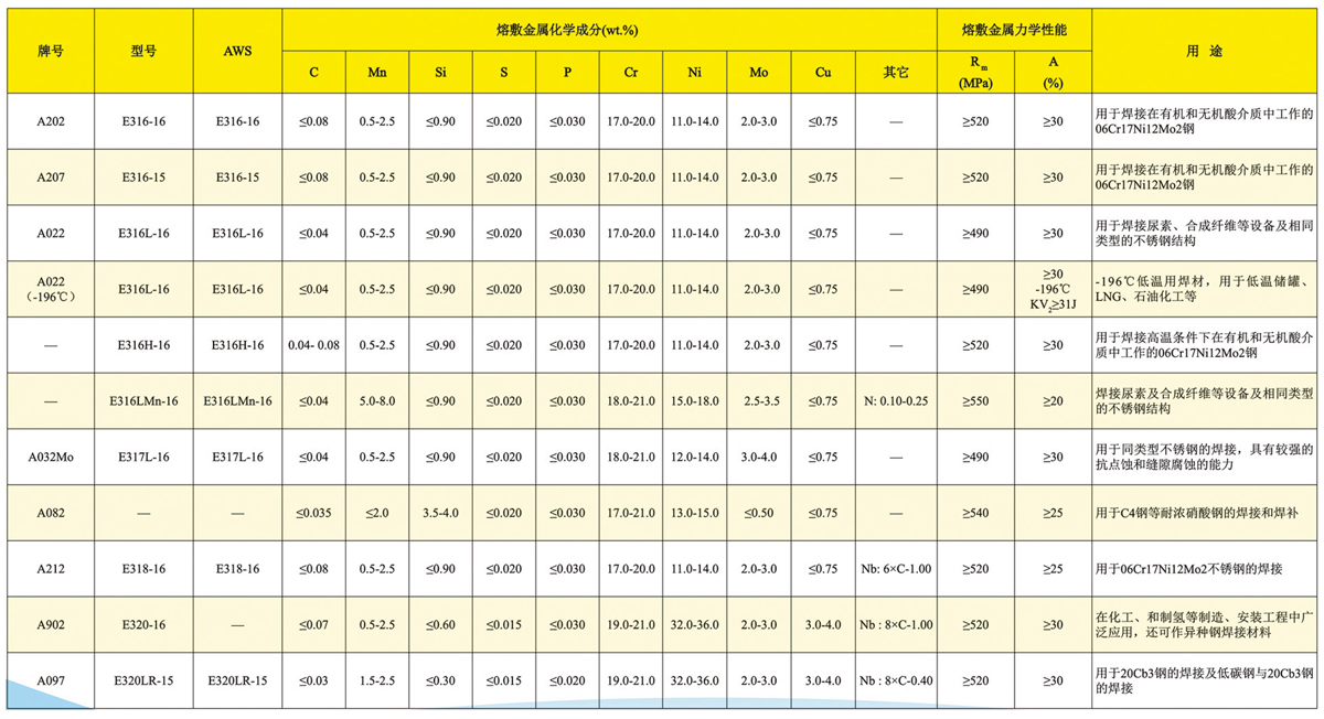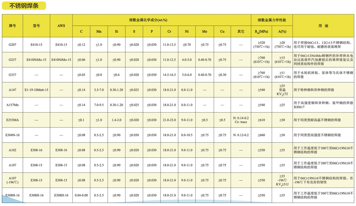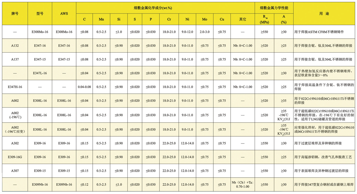 不銹鋼焊條具有良好的力學(xué)性能及抗晶間腐蝕性能,操作性能極好,能進(jìn)行全位置焊接。用于焊接工作溫度低于300°C的耐腐蝕的0Cr19Ni9,0Cr19Ni11Ti不銹鋼結(jié)構(gòu)義及構(gòu)義及堆焊不銹鋼表面層。